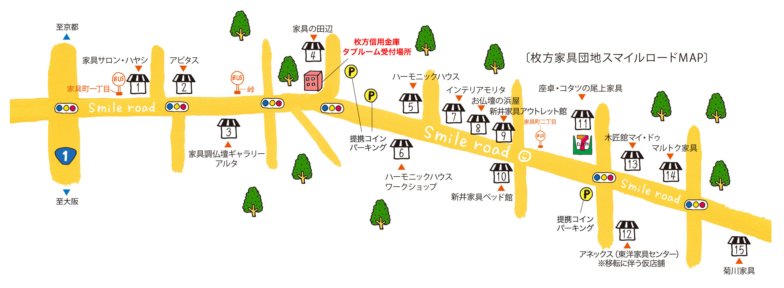 長尾駅より約3分、松井山手駅より5分で枚方家具団地に到着。