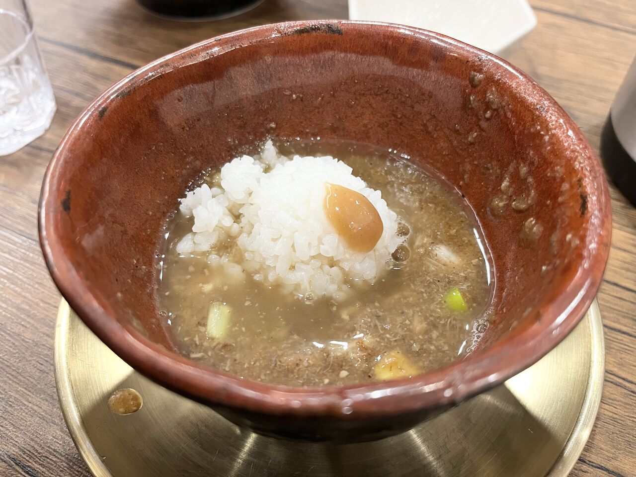 ご飯と出汁を頂けるのでお好みの濃さ、味に調整します。出汁は優しい味で濃いつけ汁、ご飯と絡んで最高の〆に!