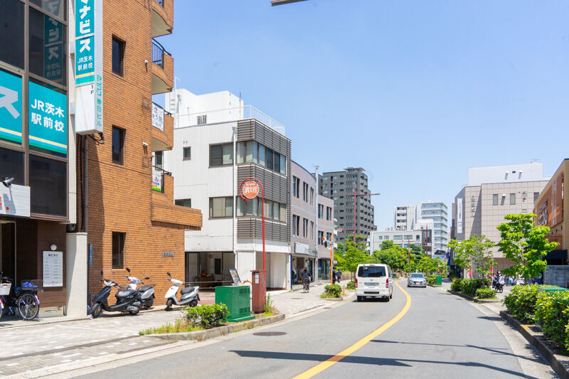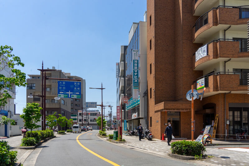 お店が左にあって、こっちにいくとJR茨木駅の西口の北側をかすめます。
