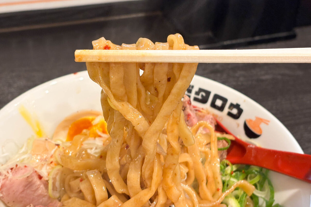 平たい中太麺に醤油ベースのタレがよく絡んでめちゃくちゃ美味しい!