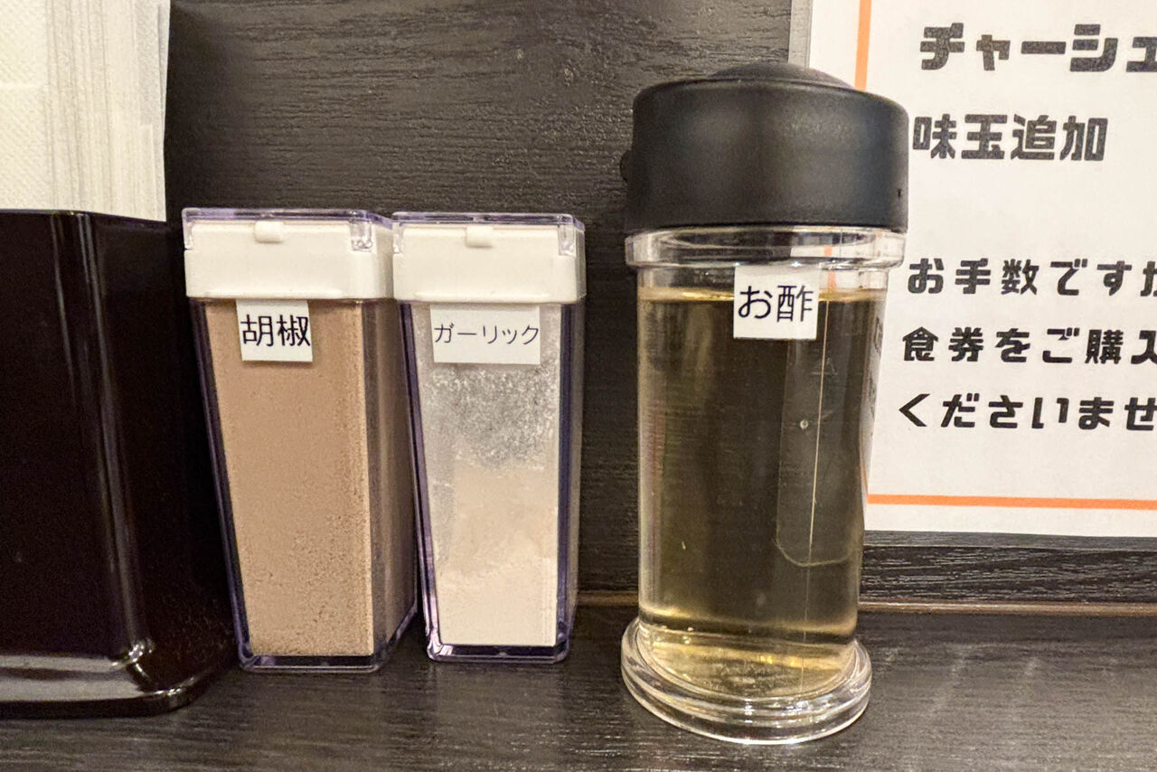 卓上には胡椒、ガーリック、お酢が置いてあり味変が可能です。