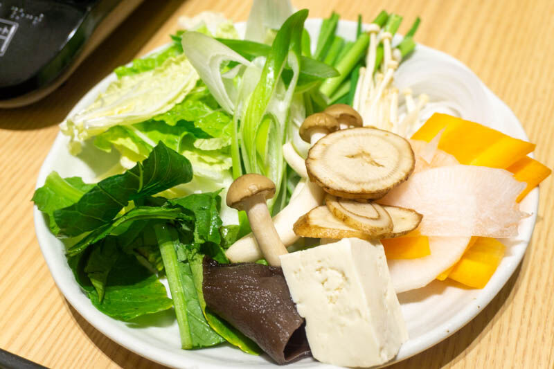 お鍋の出汁が2種類から選べるんですが、お店の方おすすめの「焼き鯛の塩だし」と「すき焼き」とにしました〜!