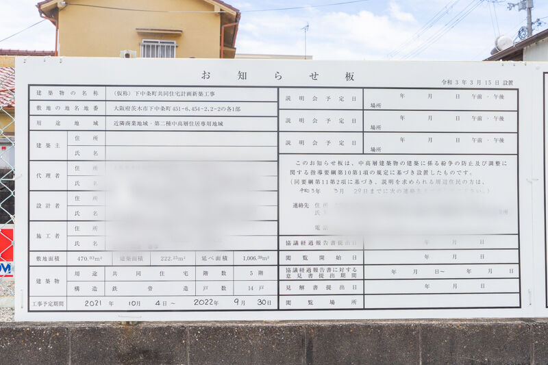 お知らせ板をみると、5階建て14戸のマンションができることがわかります。
