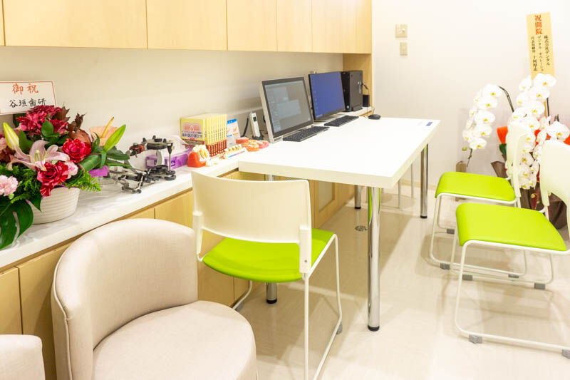 まずは受付!診療室は奥にあるドアを進むとあります。