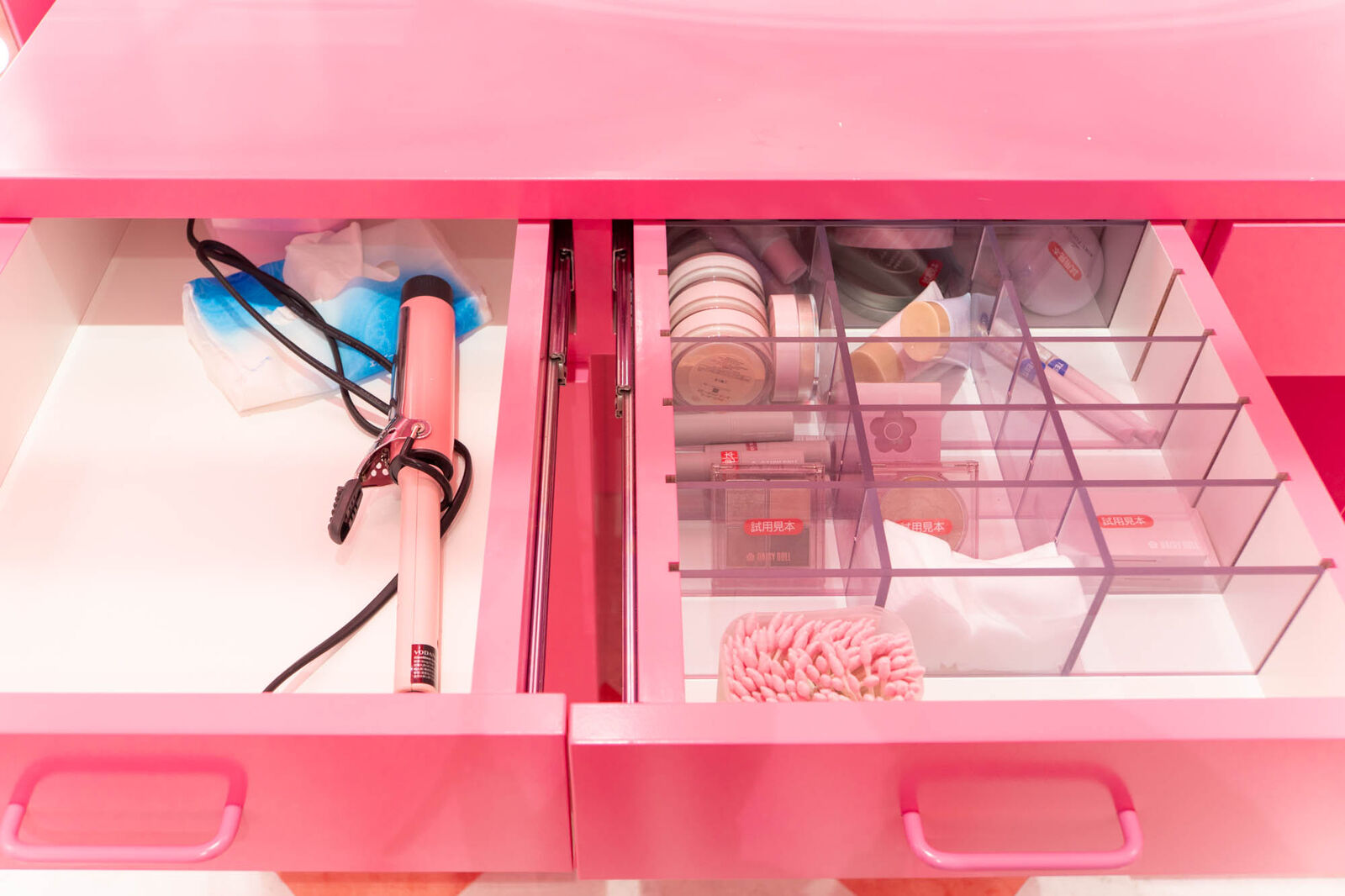 下地からアイシャドウ、綿棒、コットンまでいっぱい。ヘアアイロンも何種類かあり、自分の好きなものを試せます。