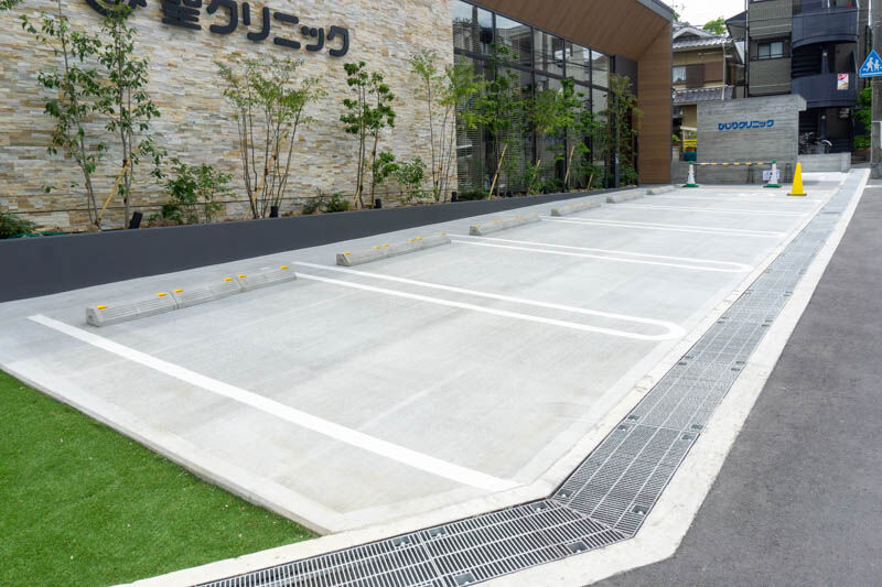 クリニックの目の前に駐車場。ここには6台停めることができ、その他に近くのモータープールにも専用の駐車場が6台あるようです。