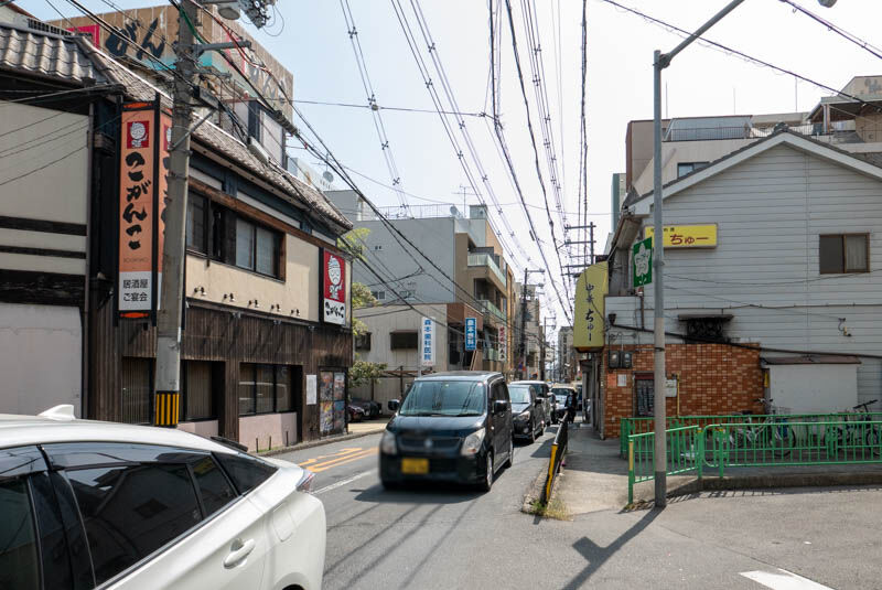 府道139号線(枚方茨木線)に面していて、こっちへ行くと阪急茨木市駅の北側。駅に続く歩道橋が見えています。