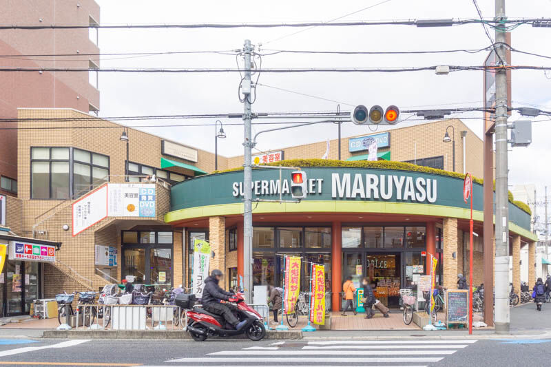 店舗に背を向けると、スーパーのマルヤス。