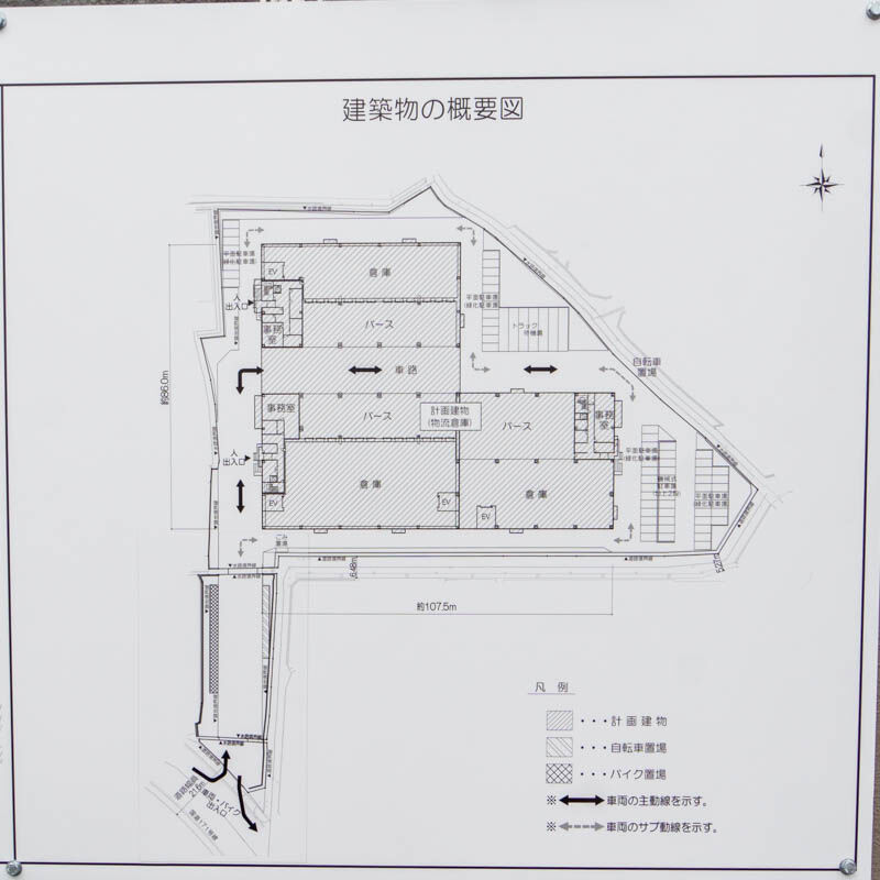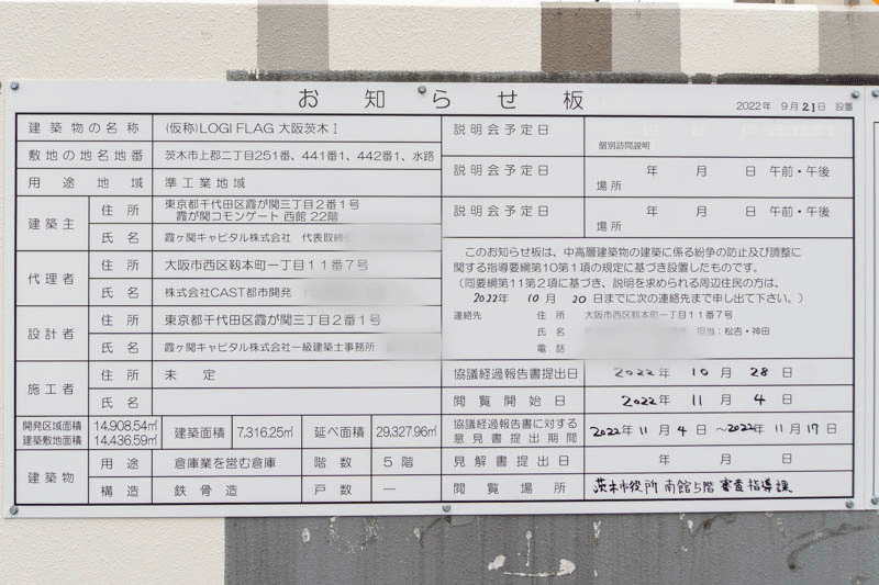 詳細を見てみると、この場所には5階建ての「LOGI FLAG 大阪茨木I(仮称)」という物流倉庫が建設予定とのこと。