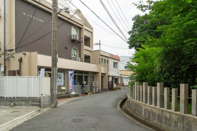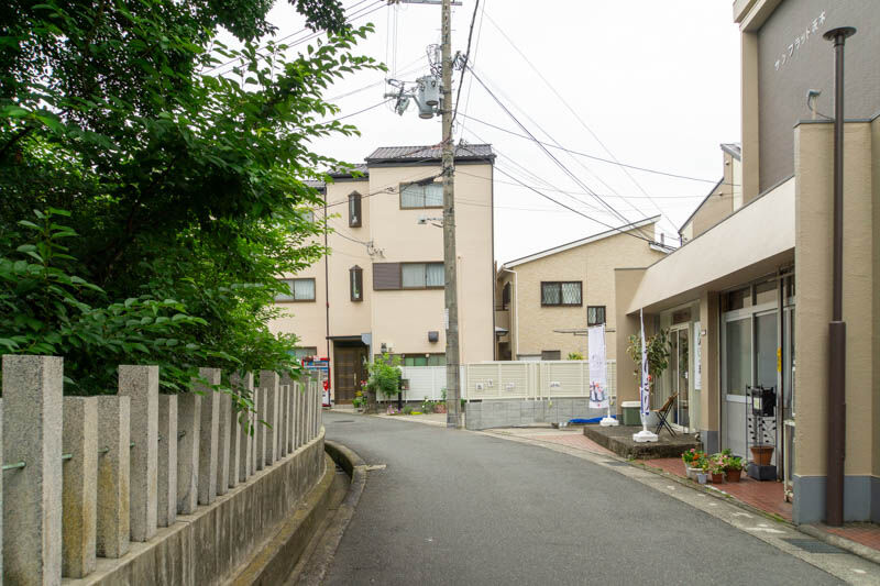 店舗の向かいには倍賀春日神社があり、反対方向に行って茨木工科高校沿いを抜けると、「新鮮や」やキリン堂、丸源などがある方へ。