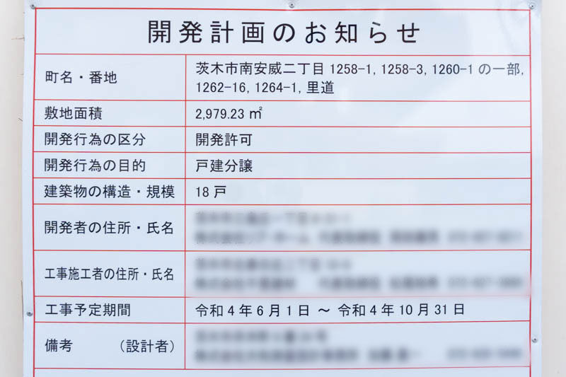 開発計画の看板には、18戸の戸建て分譲の工事が始まる予定が書かれていて、期間は6月1日〜10月31日(予定)だそう。