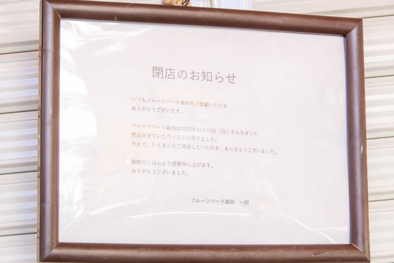 阪急本通商店街の「フルーツパーラー森田」が閉店してる