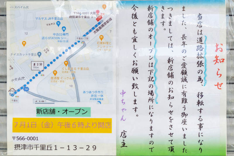 府道14号線ぞい千里丘のたこ焼き店「中ちゃん」が道路拡張のため移転するみたい。7月1日オープン