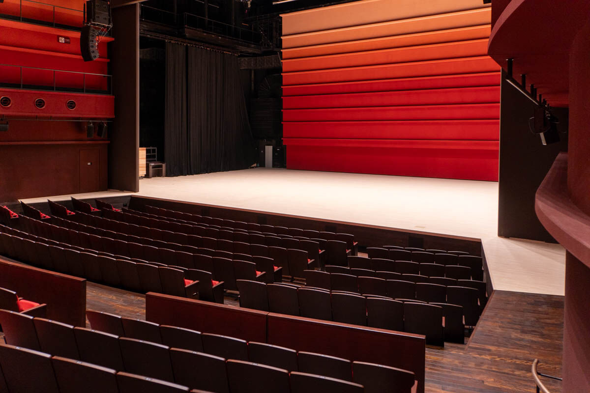 スイッチを押すと自動で昇降し、舞台と一体となって大きな平土間にすることも可能!すごい最先端!