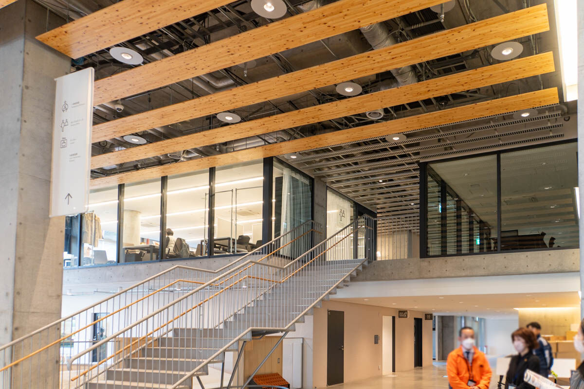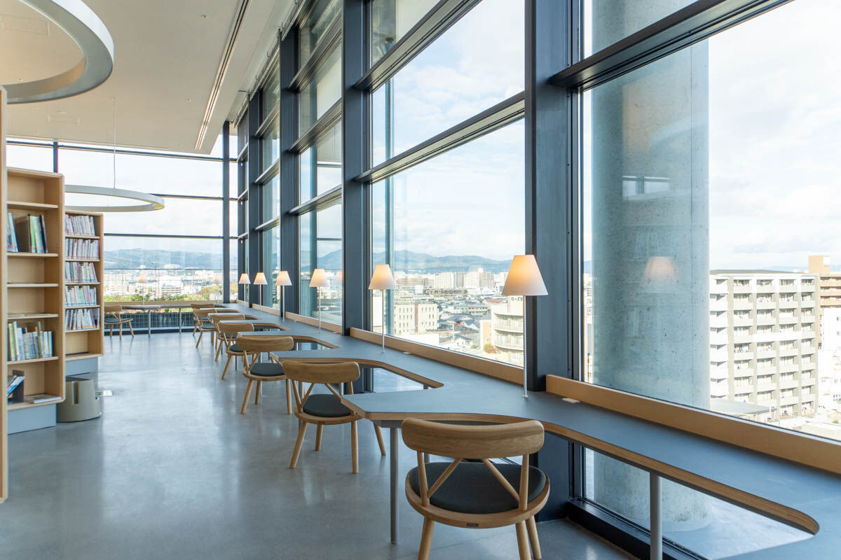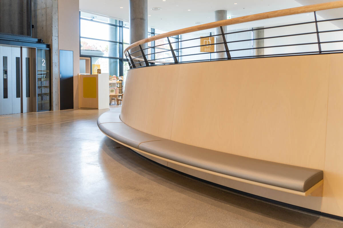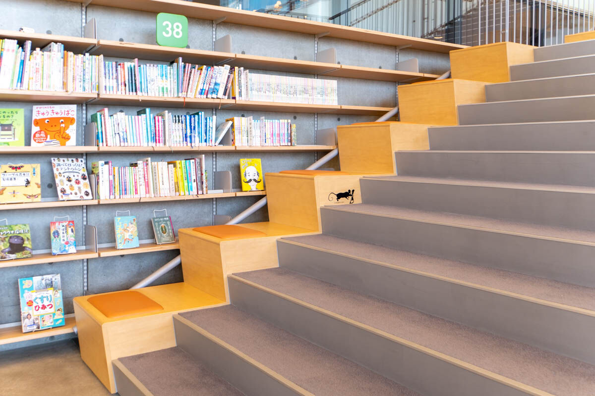 5階から6階へは階段でも移動できまして、階段の端っこもベンチになっていました〜!こういった設計も、市民の方の声を参考に作られたんだそう。