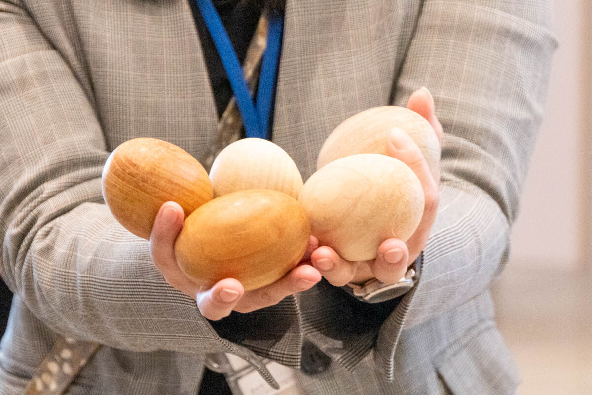 「たまごの池」では、桜・イチョウ・クス・トウカエデ・エノキなど様々な樹種を使った卵状のボールが敷き詰められています。大きさや色、香りなども違うんだそう。