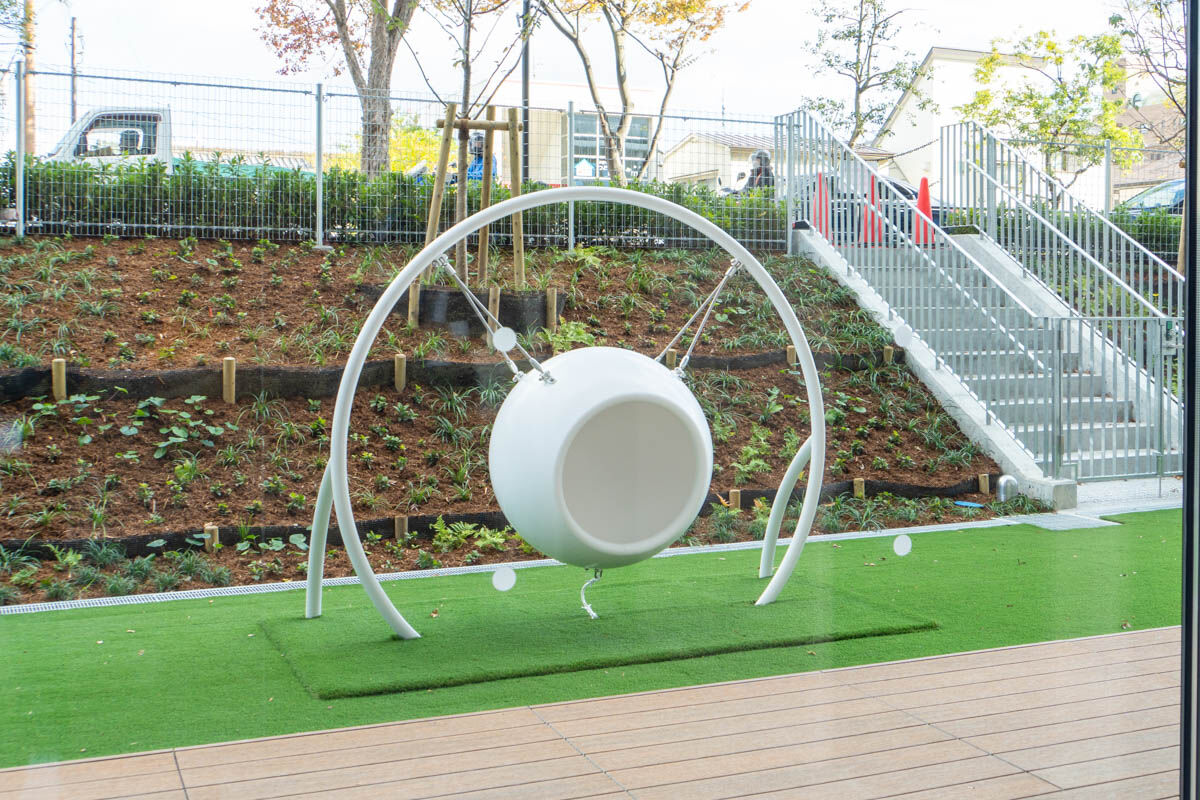 施設の正面に広がる芝生は、上の歩道につながるように緩やかな傾斜があります。