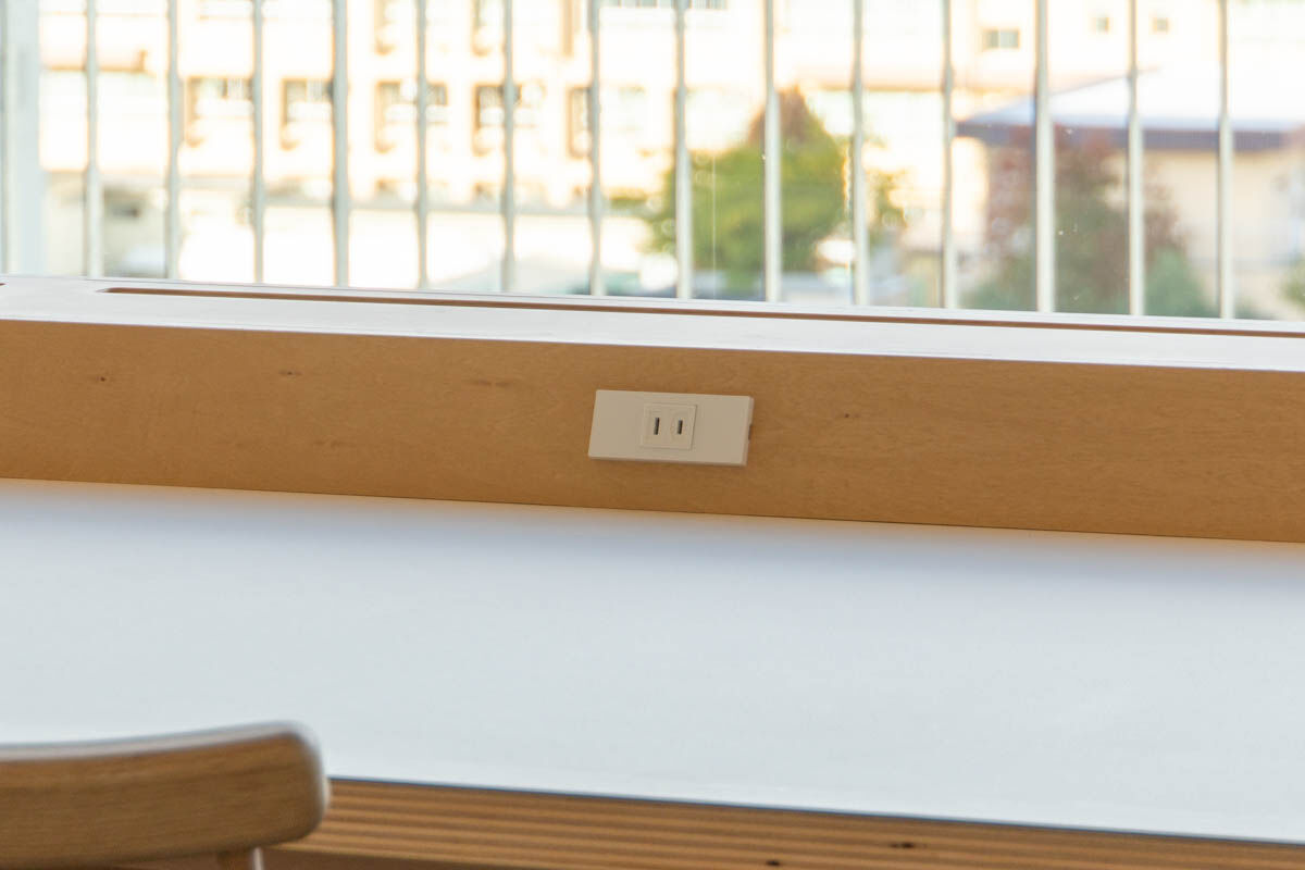 通路に沿うように2人席もあります。テーブルの中央には2口のコンセントも。