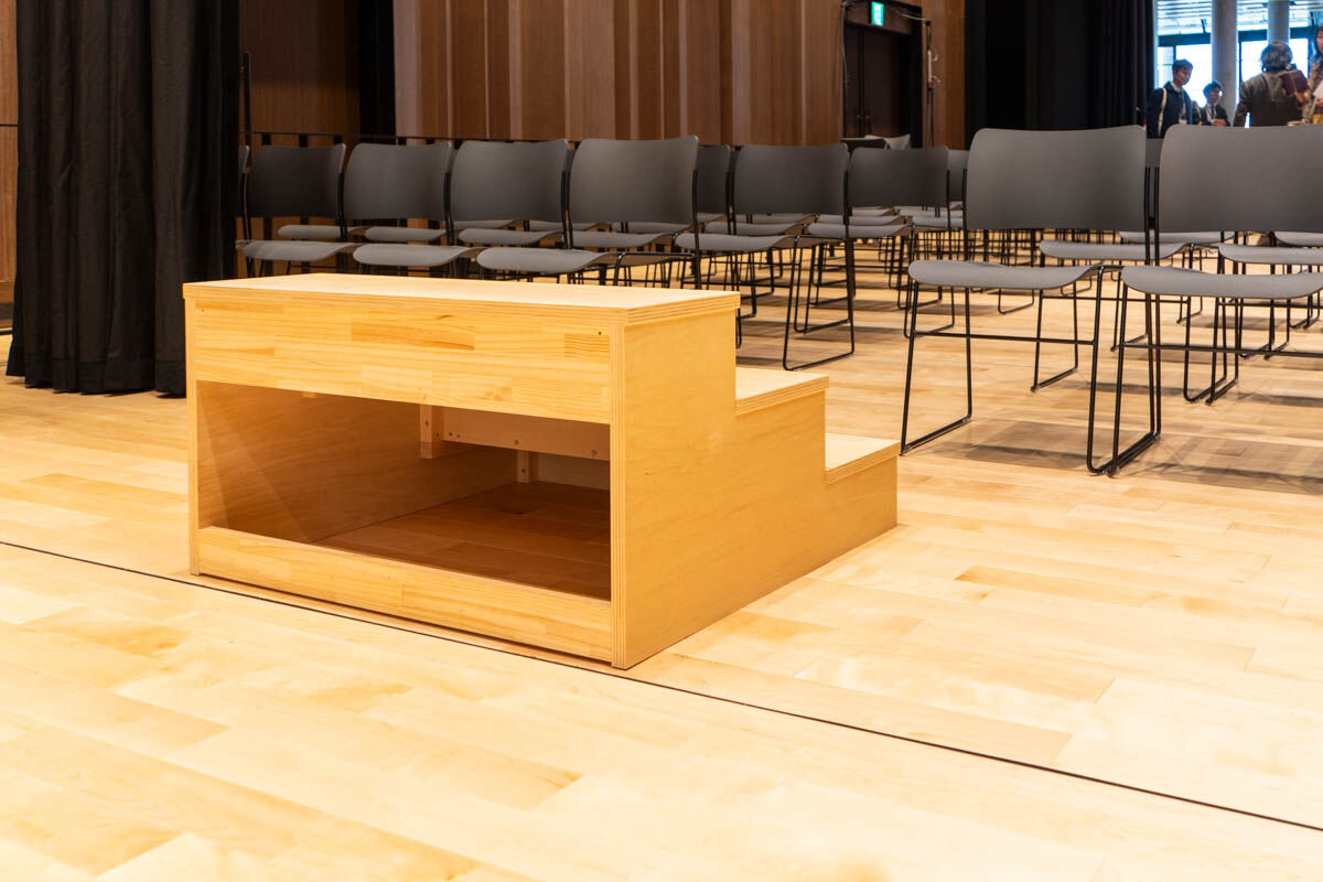 写真は平土間にしたあとで、階段分だけ昇降したという図です。