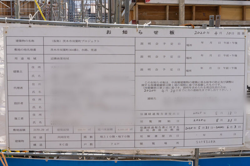 建物について。10階建て74戸のRC造のマンションができることがわかります。