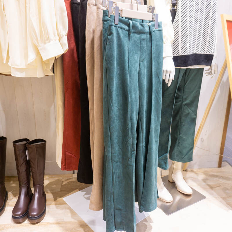 フレアパンツが一押しだそうで、こちらは秋冬に着られるスエードのような生地。ほかにもジーンズなどのフレアパンツもありました。