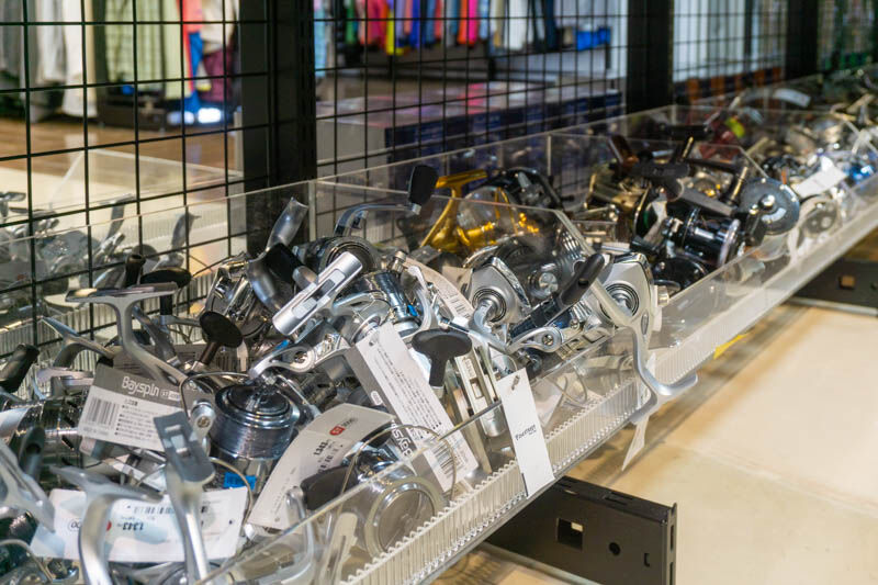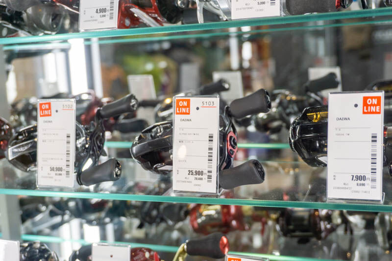 このショーケースの中には、ランプやリールなどの高額商品が入っています。
