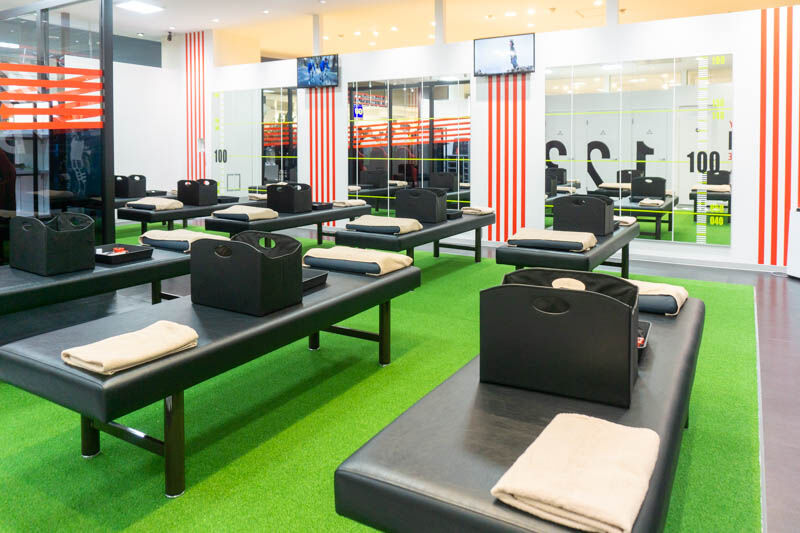 入り口ちかくのこのエリアは、待機したり、ストレッチのフィードバックなどをする場所。