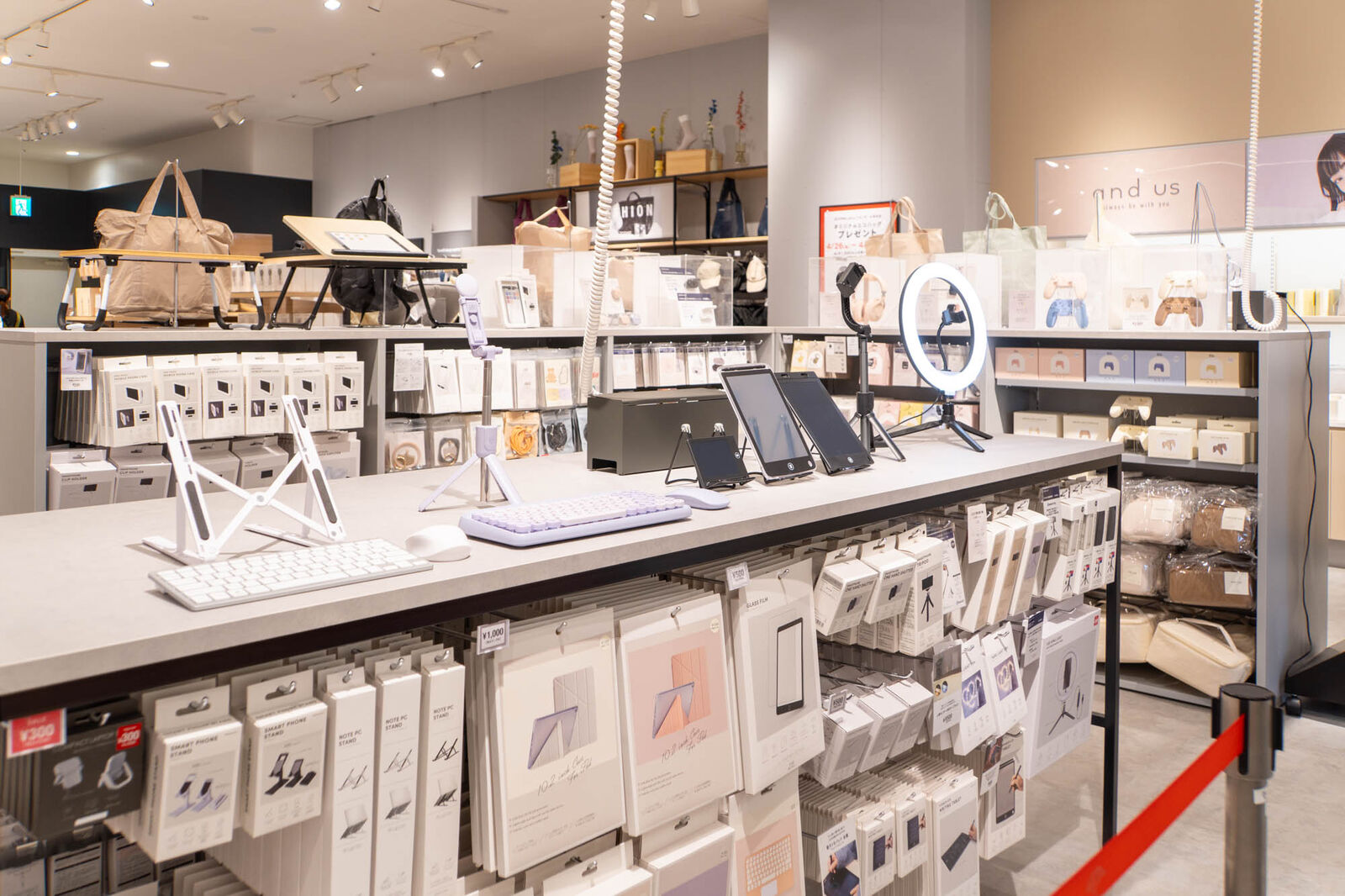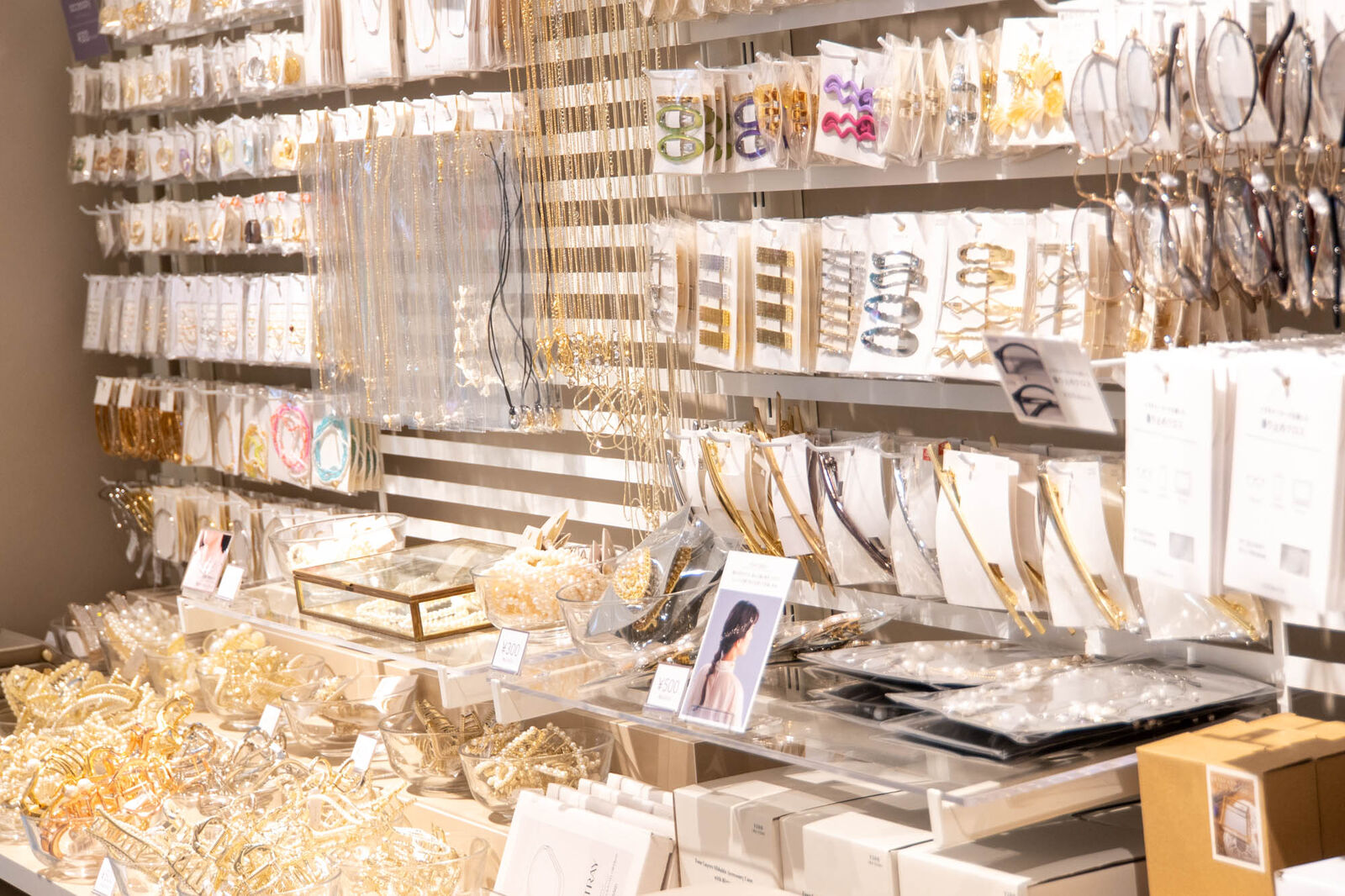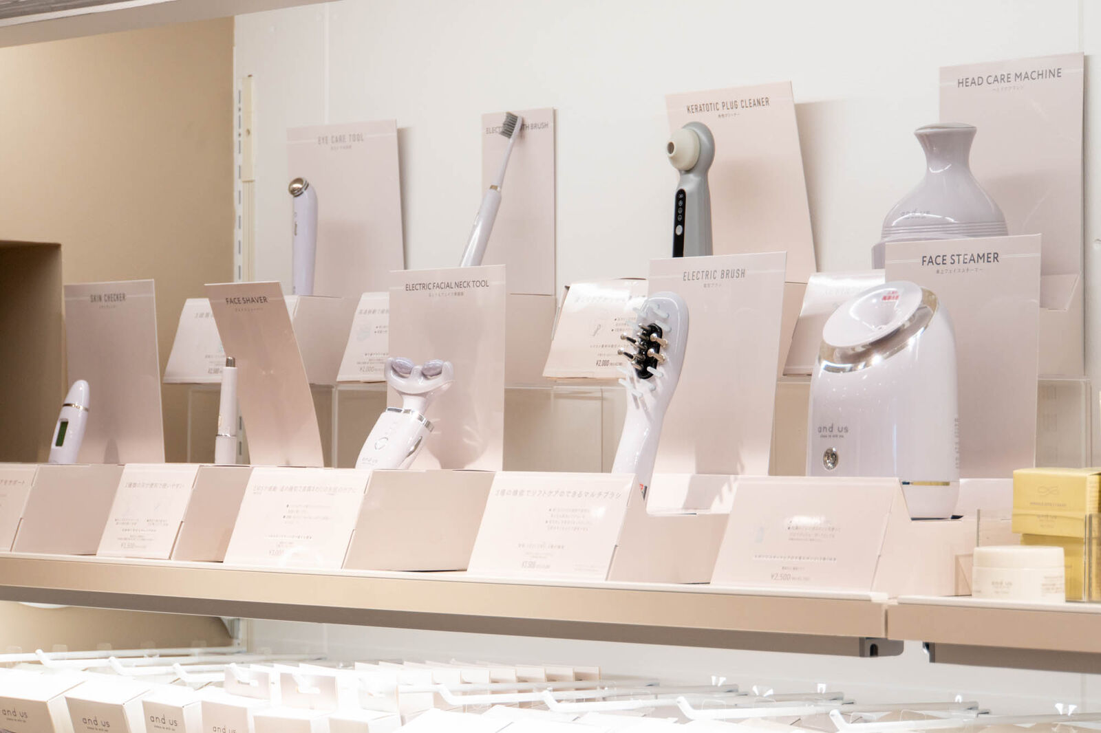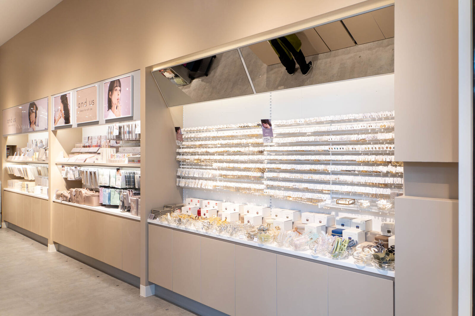 アクセサリーや美容家電のコーナーはピンクベージュの壁紙で柔らかい雰囲気に。