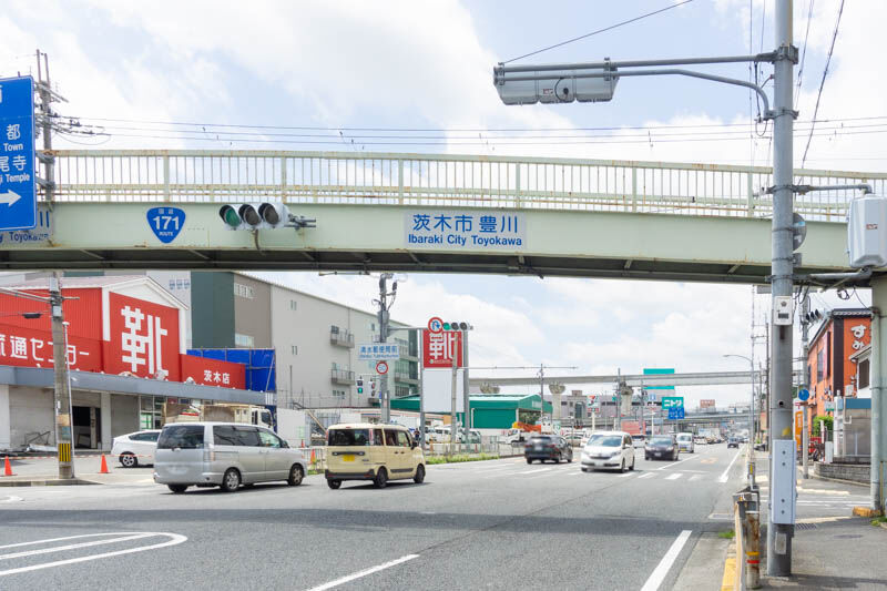 こっちに行くと、キコーナタウンや一蘭、不二家などがあり茨木IC方面。