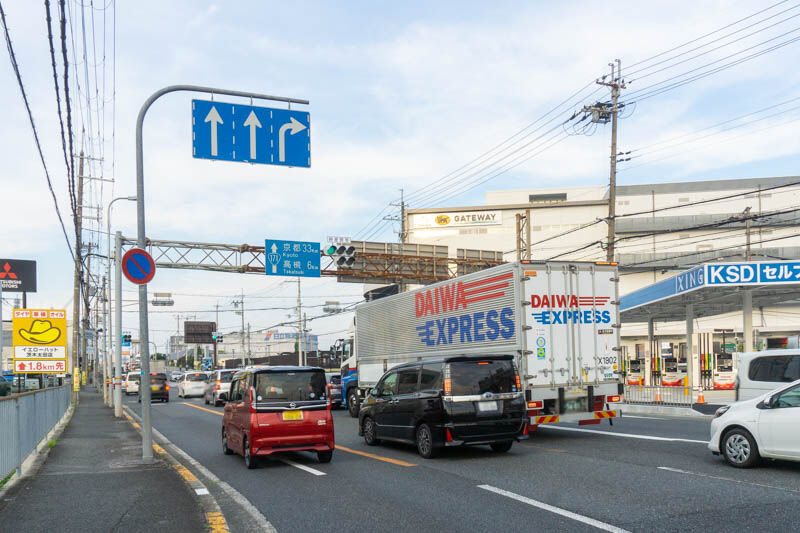 反対方向に行くと、ヤマト運輸関西ゲートウェイベースや道路の立体交差化工事が行われている西河原西交差点、西河原公園などがある方面。