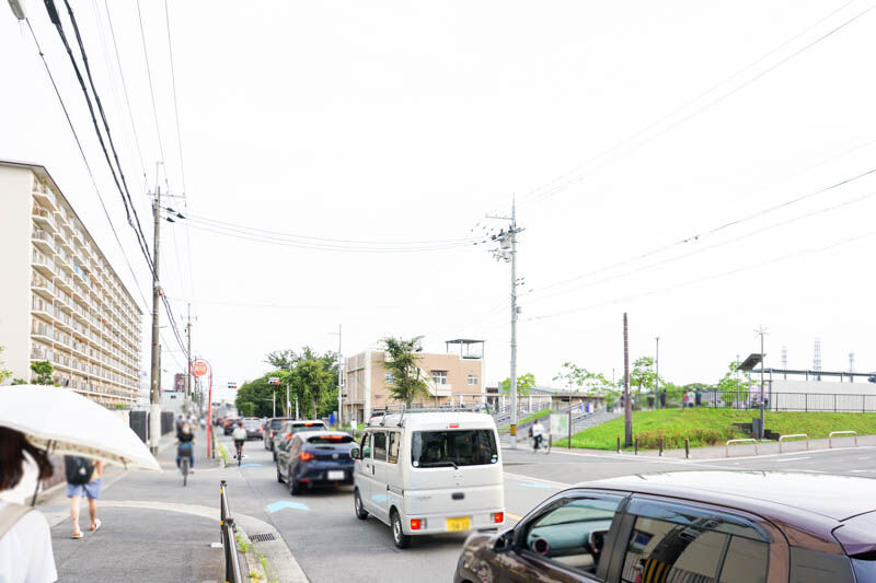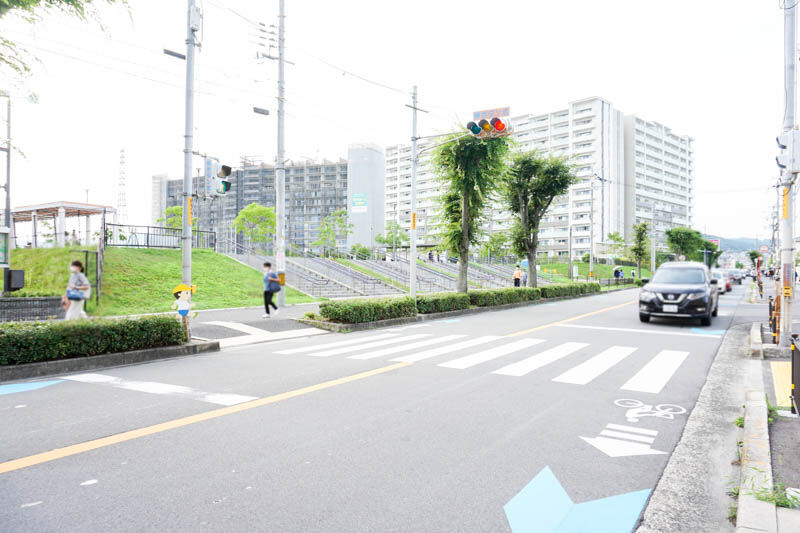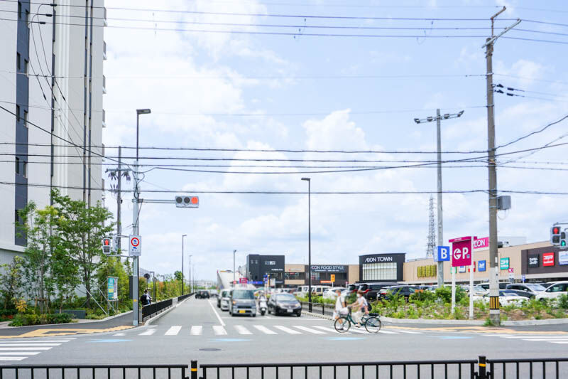 右手にイオンタウン茨木太田、左側のマンション「茨木ICO CITY」のさらに左隣となりが西河原公園北側エリア。